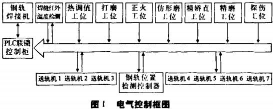 (2)電氣部分技術(shù)原理:電氣控制系統(tǒng)主要由:紅外光電傳感器、紅外溫度傳感器、接近開關(guān),可編程控制器、變頻器、繼電器等組成,在送軌機上裝有紅外溫度傳感器和紅外光電傳感器、生產(chǎn)線的各工位上安裝了鋼軌運行位置檢測傳感器和工作狀態(tài)檢測以及工作結(jié)束操作按扭。焊接生產(chǎn)線的工作狀態(tài)通過各工作位置操作面板與總控制柜連接,根據(jù)鋼軌走行位置和工作狀態(tài)檢測信息輸送到可編程控制器,并向鋼軌焊接工位發(fā)送開啟和鎖閉生產(chǎn)線的鋼軌運行信號。電氣控制框圖如圖1。