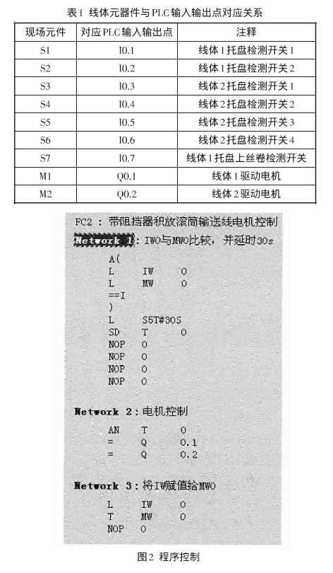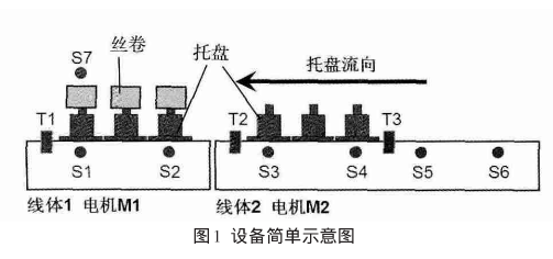 設備的簡單示意圖如圖1所示,共有兩段線體:線體1上有1個阻擋器(T1),2個托盤檢測開關S、S2同時有信號,代表該段托盤已滿;同時無信號,代表該段無托盤),1個絲卷檢測開關S7)1個滾筒驅動電機(M1);線體2上共有2個阻擋器(T2、T3),4個托盤檢測開關(S3、S4、S5、S6,開關作用與S1、S2類似),1個滾筒驅動電機(M2)該控制方法的原理是:以相鄰的且功能相近的多條線體為控制對象,檢測線體上檢測開關的變化,如在設定時間內檢測開關狀態均無變化,則說明這部分線體處于堆積或空轉狀態,停止該部分線體電機運行,在開關狀態發生變化或者其他條件觸發下,電機可再次啟動。